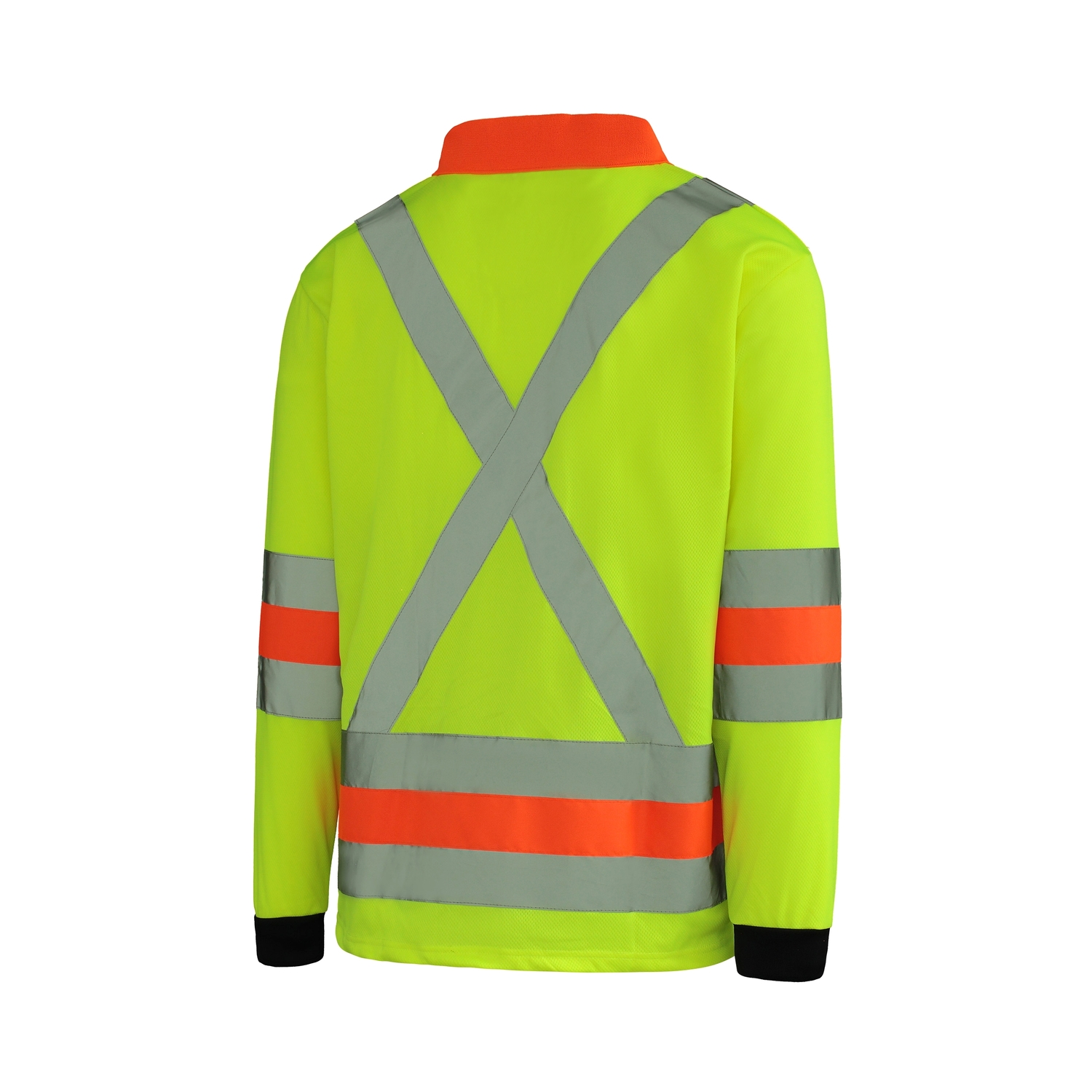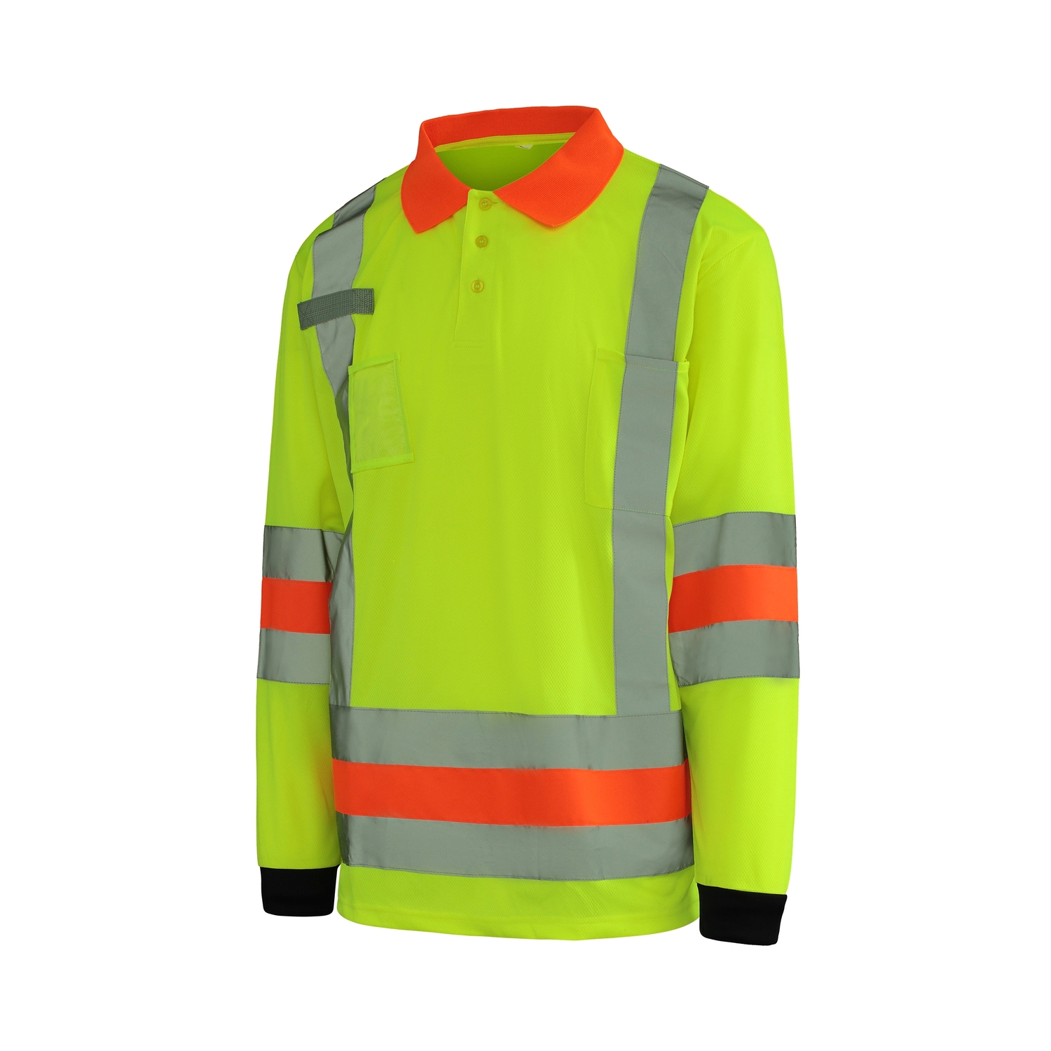 Chandail du signaleur (manches longues). Chandail haute visibilité à manches longues pour signaleur, en polyester Birds Eye à séchage rapide. Il dispose de bandes réfléchissantes inversées au torse et aux bras, d’une pochette d’identification et support pour radio.