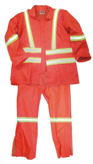 Ensemble de polyester 420 deniers avec bandes réfléchissantes enduit de P.V.C. Capuchon détachable sert d’étui pour l’ensemble. Manteau entièrement doublé en filet. 2 poches à  l’avant et ventilation avant et arrière. Pantalon à  bavette. Coutures scellées.